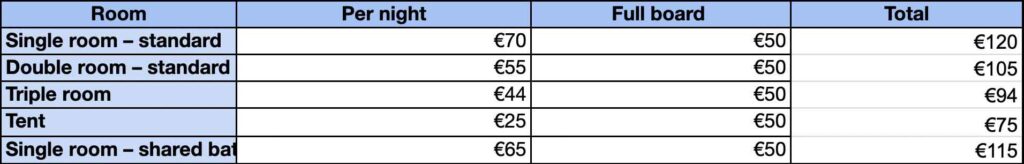 - 490€ from April 16th, 2026 plus accommodation/meals, own travel arrangements